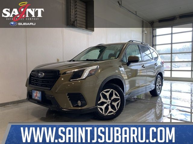 Saint J Subaru is proud to present you with another True Market Priced Pre-Owned Vehicle. Transparent Pricing Of $ 26472 !! This 2023 Subaru Forester Premium is loaded with the following Factory Options: Blind Spot Detection w/RCTA & Power Rear Gate (Blind-Spot Detection (BSD), Driver's Seatback Divided Pocket, Dual USB Charge Ports, EyeSight System, Multi-Function High Grade Display, and Power Rear Gate), 3.70 Axle Ratio, 4-Wheel Disc Brakes, 6 Speakers, ABS brakes, Air Conditioning, Alloy wheels, AM/FM radio: SiriusXM, Anti-whiplash front head restraints, Auto High-beam Headlights, Automatic temperature control, Brake assist, Bumpers: body-color, CD player, Driver door bin, Driver vanity mirror, Dual front impact airbags, Dual front side impact airbags, Electronic Stability Control, Emergency communication system: STARLINK Safety and Security (Subscription Required), Exterior Parking Camera Rear, Four wheel independent suspension, Front anti-roll bar, Front Bucket Seats, Front Center Armrest, Front fog lights, Front reading lights, Fully automatic headlights, Heated door mirrors, Heated Front Bucket Seats, Heated front seats, Illuminated entry, Knee airbag, Low tire pressure warning, Occupant sensing airbag, Outside temperature display, Overhead airbag, Overhead console, Panic alarm, Passenger door bin, Passenger vanity mirror, Power door mirrors, Power driver seat, Power moonroof: Panoramic, Power steering, Power windows, Premium Cloth Upholstery, Radio data system, Radio: Subaru Starlink 6.5" Multimedia Plus System, Rear anti-roll bar, Rear seat center armrest, Rear window defroster, Rear window wiper, Remote keyless entry, Roof rack: rails only, Security system, Speed control, Speed-sensing steering, Split folding rear seat, Spoiler, STARLINK/Apple CarPlay/Android Auto, Steering wheel mounted audio controls, Tachometer, Telescoping steering wheel, Tilt steering wheel, Traction control, Trip computer, Variably intermittent wipers, and Wheels: 17" x 7.0 J Black Machine Finish Alloy!!